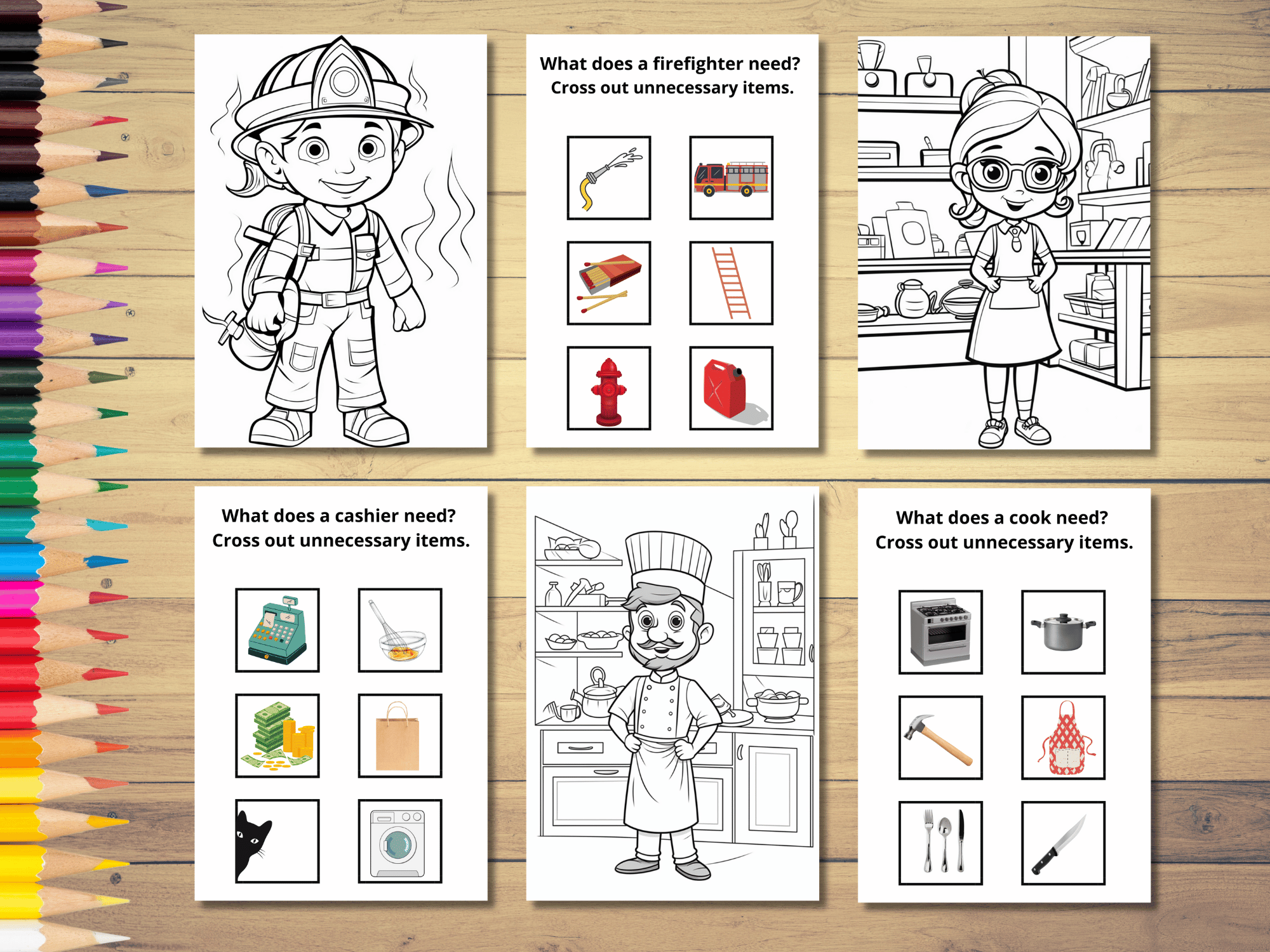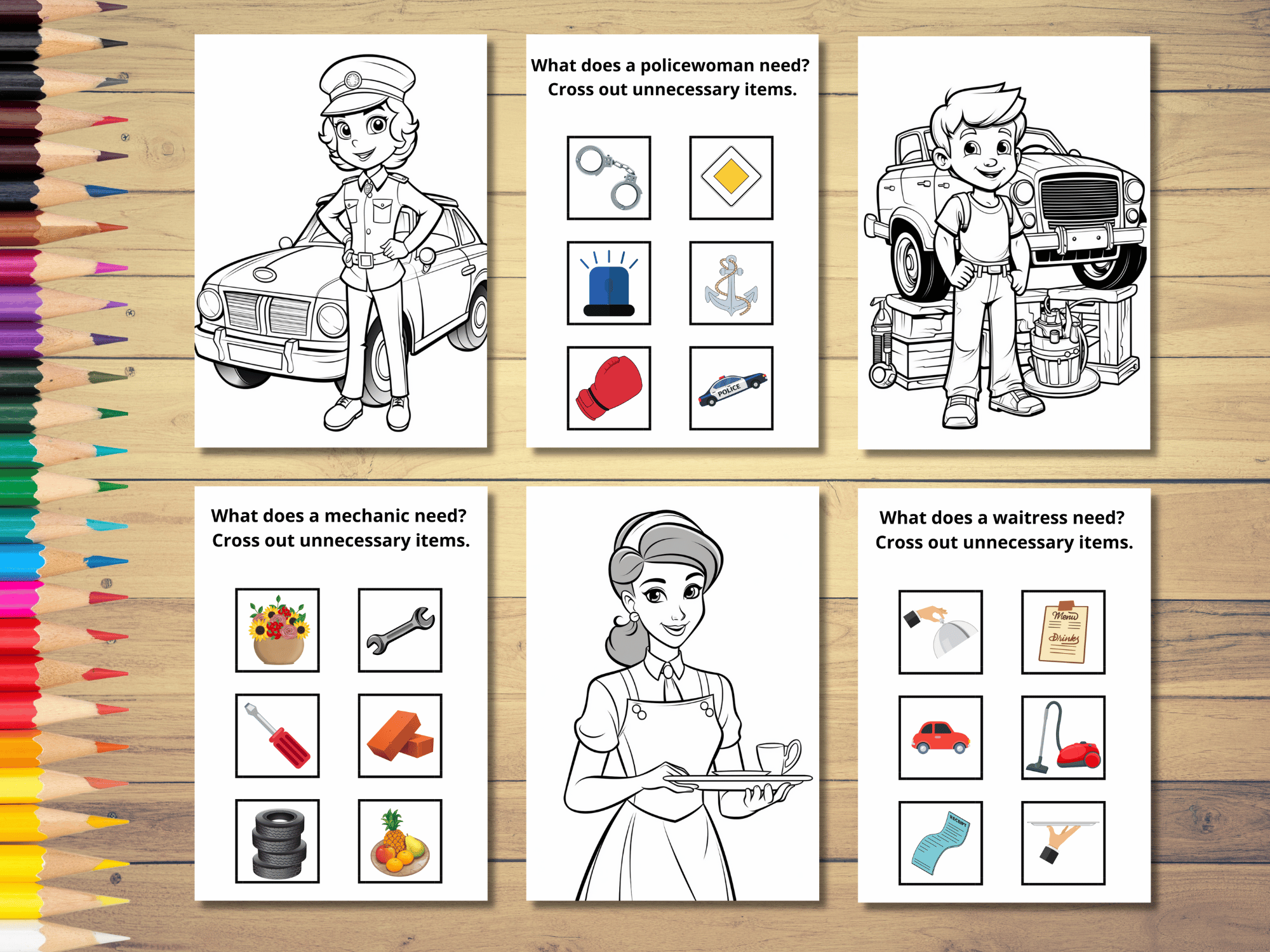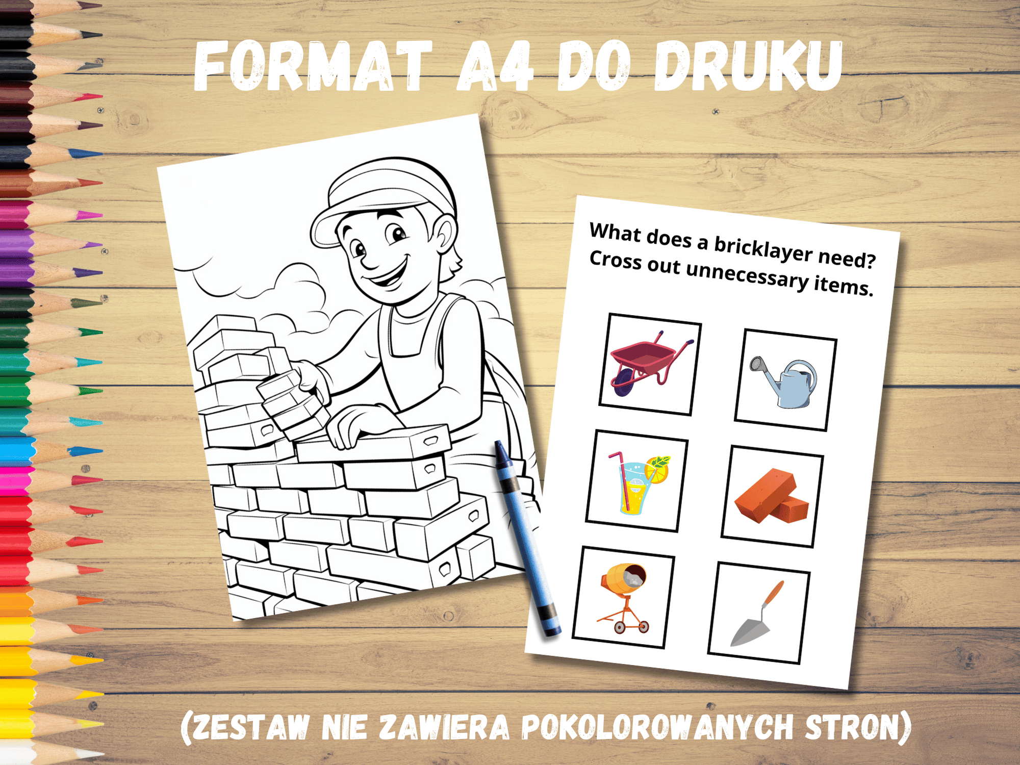 Kupując nasze kolorowanki nie musisz mieć wyrzutów sumienia, że Twoje dziecko traci cenny czas. Tworząc pliki, stawiamy duży nacisk na aspekt edukacyjny i rozwój zdolności manualnych. Karty pracy “Poznajemy zawody” składają się z 10 kolorowanek przedstawiających popularne profesje, które chciałyby wykonywać dzieci w przyszłości (pielęgniarka, strażak, policjantka, murarz, kasjerka, nauczyciel, itp) oraz 10 kart z zadaniami, które polegają na doborze atrybutów do przedstawicieli zawodów. Nasza kolorowanka stwarza również okazję do rozmów z dziećmi na temat ich zainteresowań, talentów, preferencji. Dedykowana jest dla dzieci w wieku 5-8 lat.